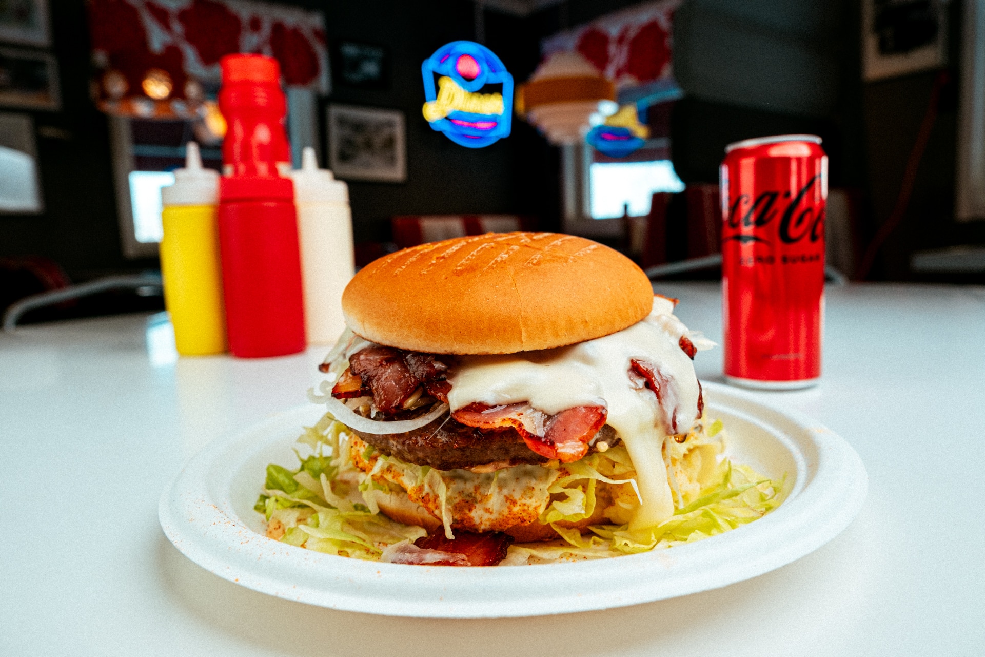 Hamburgare med sallad, chilicheese, ostsås, sweetchili dressing, rostad lök & ost. Inkl. 33 cl dryck
