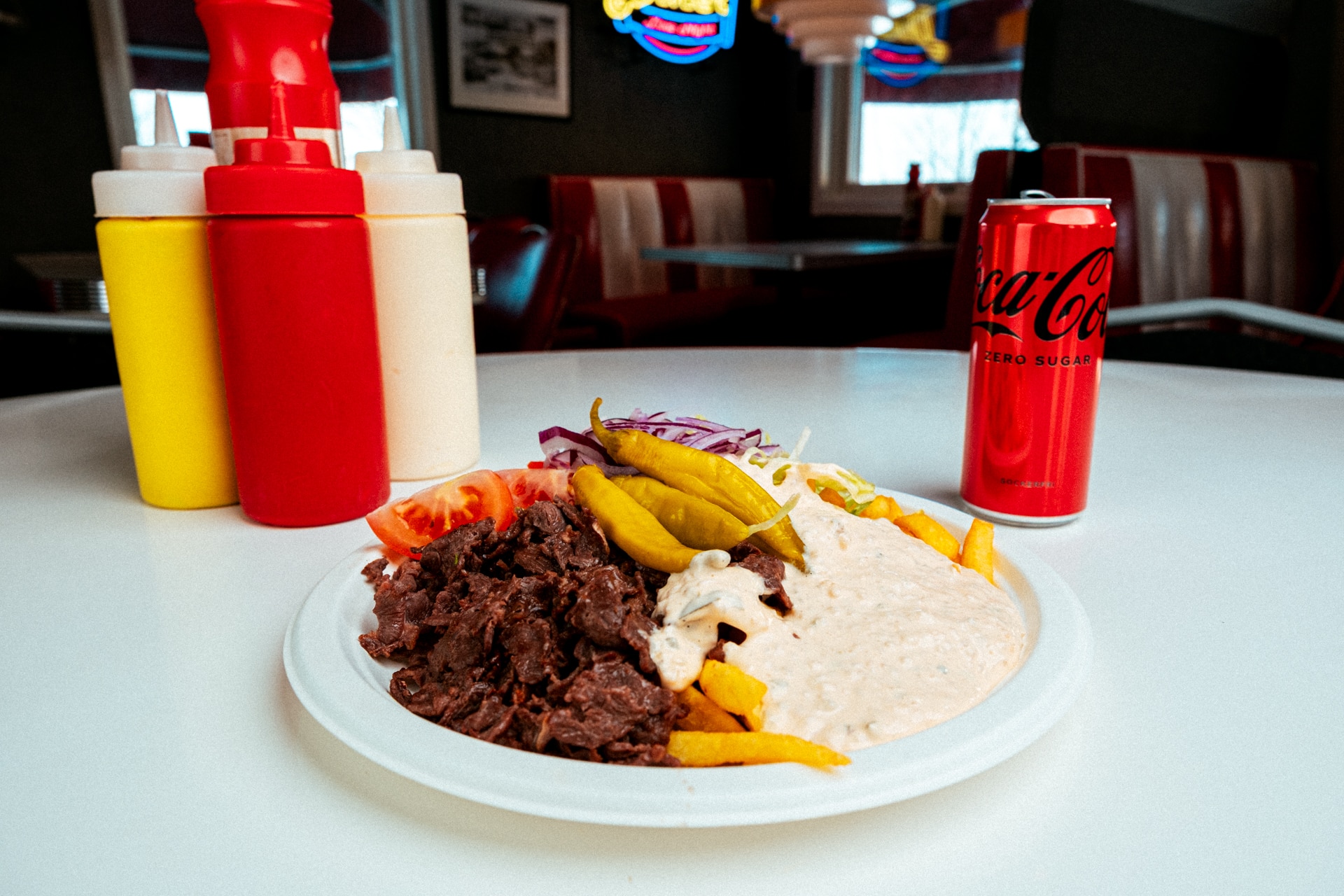 Med gurkmajonäs och curryketchup inkl. strips och läsk